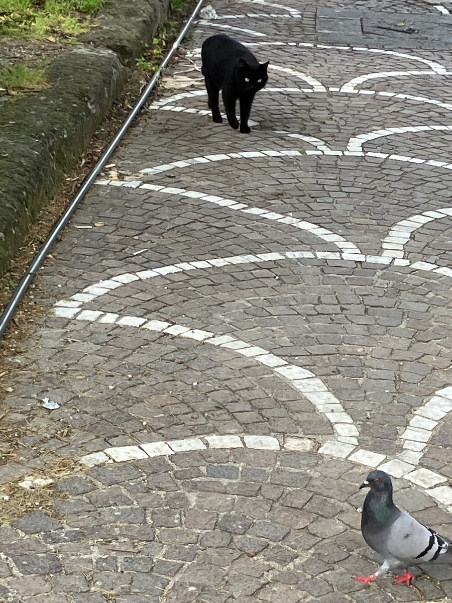 これは、遺跡の入り口にいた黒猫ちゃん(と鳩)です。