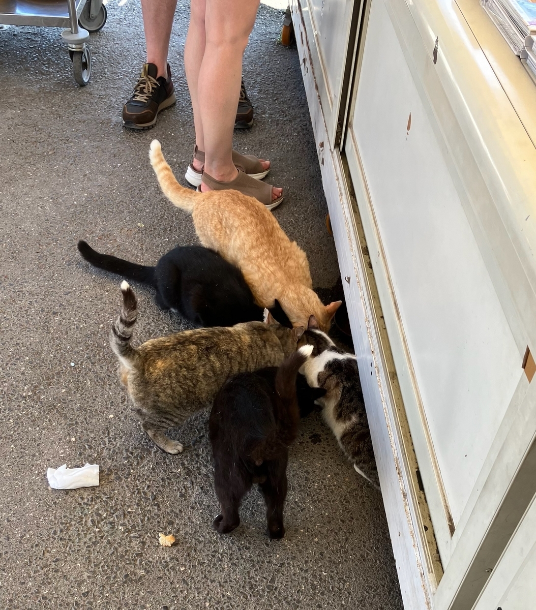 ↓露店の人からもらったご飯を奪い合うポンペイキャッツ。